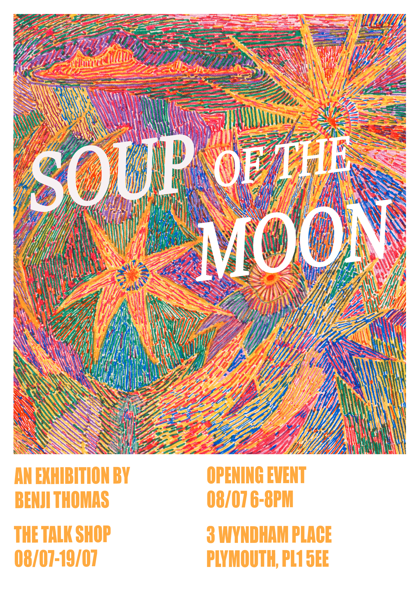 Soup of the Moon is an experimental response to the nocturnal landscape, drawing from sketches and photography taken over the last 6 months. It features work that explores how the arrival of nighttime breaks down and transforms everyday spaces into more ambiguous scenes. At nighttime information is lost, and our familiar spaces become malleable, uncertain, and subject to re-interpretation.